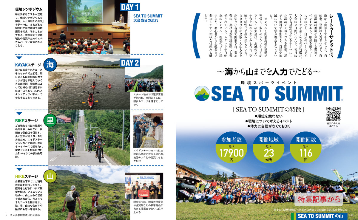 海から山へと、人力で旅をしてみると、自然界の豊かな循環が感じられる。登山だけでなくカヤックや自転車も交えた環境スポーツイベント「SEA TO SUMMIT(シー・トゥ・サミット)」の日本各地のコースをたどり、名山と海との繋がりを見つめる。