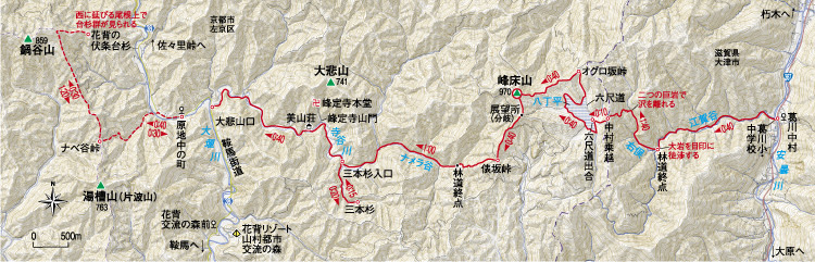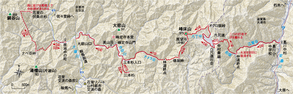 コースタイム●[日帰り]葛川中村(40分)林道終点(1時間40分)中村乗越(10分)六尺道出合(40分)オグロ坂峠(40分)峰床山(40分)俵坂峠(1時間)三本杉入口(20分)三本杉(15分)三本杉入口(40分)大悲山口 計6時間45分