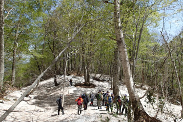花や新緑、残雪など、春の山はさまざまな顔を見せる。